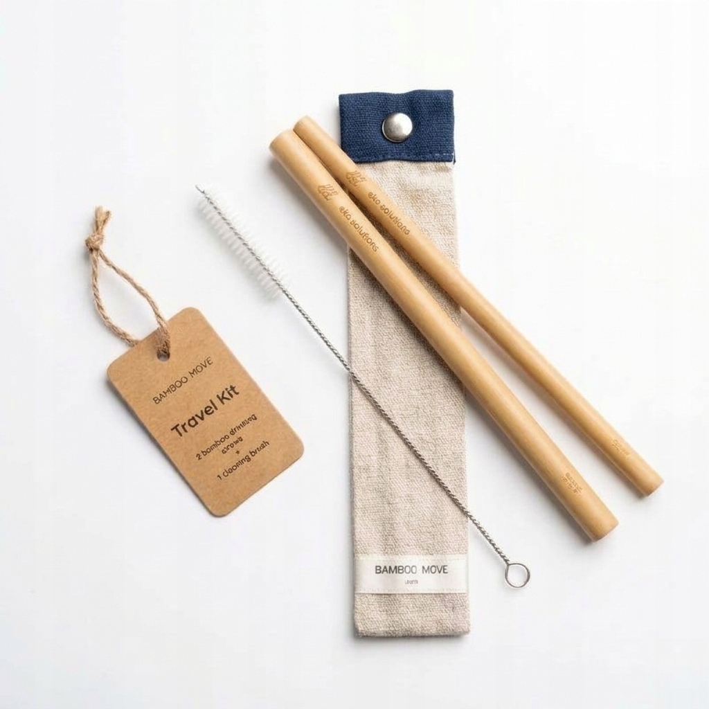 Ekologiczny zestaw wielorazowych słomek bambusowych z bawełnianym etui i szczoteczką do czyszczenia.